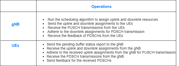 И UL и планировщики DL, запущенные в начале паза, когда первый символ является символом DL. Планировщики запускаются во время DL так, чтобы присвоения (UL и DL) могли быть немедленно отправлены в UEs в направлении DL. Время выполнения алгоритма планировщика, а также задержки распространения принято, чтобы быть нулем. Выход планирования операций является массивом присвоений. Каждое присвоение содержит информационные поля, чтобы полностью задать PUSCH или передачу PDSCH.