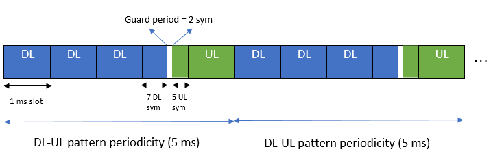 reference_scs = 15 кГц (т.е. паз на 1 мс), DLULPeriodicity = 5 мс, numDLSlots = 3, numDLSyms = 7, numULSlots = 1, numULSyms = 5