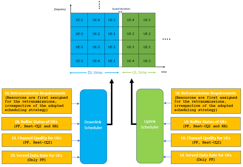 UL и планировщики DL распределяют UL и ресурсы DL соответственно среди UEs. Можно выбрать любую из реализованных стратегий планирования: пропорциональная ярмарка (PF), лучший CQI или циклический алгоритм (RR). Различные поддерживаемые входные параметры к планировщикам показывают наряду со стратегиями планирования, которые рассматривают их.
