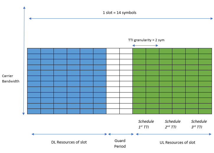 NR позволяет TTI запускаться в любом положении символа в пазе и с гранулярностью TTI в символах. Рисунок показывает способ, которым планировщик UL действует в этом примере, чтобы запланировать символы UL паза с гранулярностью TTI двух символов. Показанный паз содержит шесть символов UL. Планировщик завершает итерацию символов UL в трех итерациях с каждой итерацией, распределяющей ресурсы частоты двух символов. Планировщик DL также следует за аналогичным подходом для планирования DL.