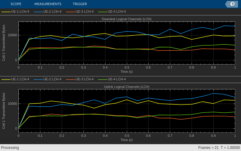 nodes = struct('UEs', {UEs}, 'GNB', gNB); metricsVisualizer = hNRMetricsVisualizer(simParameters, 'Nodes', nodes, 'EnableSchedulerMetricsPlots', true, 'EnableRLCMetricsPlots', true, 'LCHInfo', lchInfo);