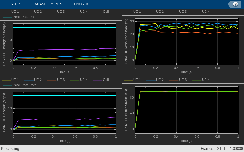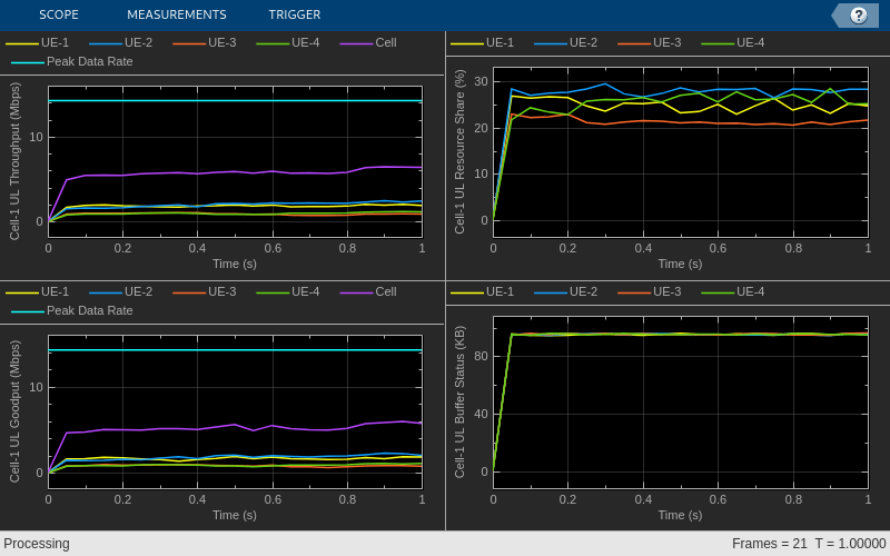 На основе выбранной стратегии планирования этот пример демонстрирует присвоение UL и ресурсов DL к нескольким UEs gNB. UL и DL планирование эффективности анализируются на основе графиков во время выполнения пропускной способности, полезной пропускной способности, справедливости доли ресурса и незаконченного буферного состояния UEs. Более полный анализ методом моделирования сообщения при помощи сохраненных журналов дает подробное изображение операций, происходящих на на символ или на базис паза.