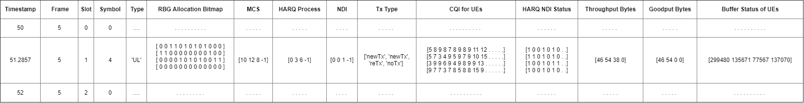 Журналы временного шага: таблица показывает запись шага шага расчета. Каждая строка таблицы представляет символ или паз, на основе выбранного типа планирования (основанный на символе или находящийся на пазе). Информация подряд для DL, если типом символа (или паз) является DL. Аналогично, для UL символ (или паз).