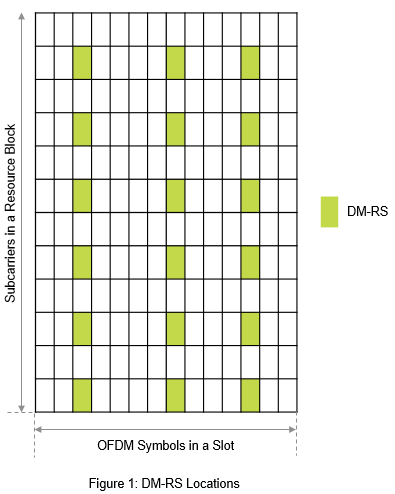 Сконфигурируйте nrCarrierConfig объект создать сетку ресурса несущей на 15 кГц с одним блоком ресурса. Сконфигурируйте nrPUSCHConfig объект получить соответствующие местоположения DM-RS как показано на предыдущем рисунке. Кроме того, сконфигурируйте параметры UCI (BetaOffsetACK, BetaOffsetCSI1, BetaOffsetCSI2, и UCIScaling). Свойство BetaOffsetACK определяет количество ресурсов для мультиплексирования HARQ-ACK в PUSCH. Свойства BetaOffsetCSI1 и BetaOffsetCSI2 определите количество ресурсов для мультиплексирования отчетов CSI в PUSCH. Свойство UCIScaling ограничивает количество REs, присвоенного UCI на PUSCH.