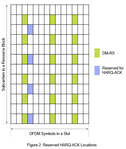 Количество зарезервированных местоположений HARQ-ACK достигается путем вычисления совпадающей с уровнем длины HARQ-ACK с количеством набора битов HARQ-ACK к 2. С заданной настройкой PUSCH, целевой скоростью кода и транспортным размером блока, количество зарезервированных местоположений HARQ-ACK равняется 4. HARQ-ACK сопоставлен с REs в символе OFDM, который доступен после первых последовательных символов DM-RS OFDM. Этот рисунок показывает местоположения зарезервированного HARQ-ACK.