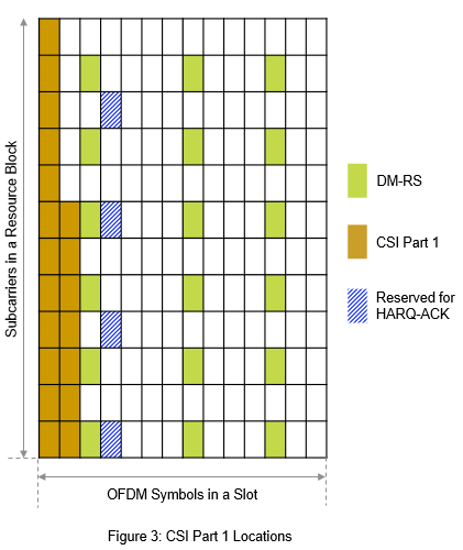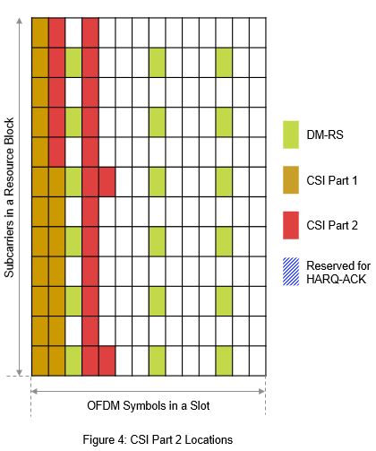 Если закодированная часть 1 CSI полностью сопоставлена, отображение закодированной части 2 CSI запускается. Отображение запускается сначала non-DMRS OFDM символ, который используется для передачи PUSCH (то есть, символ OFDM 0). В символе OFDM 0, никакие REs не доступны для передачи UCI, этот символ OFDM пропущен. В результате сопоставляя перемещения со следующим символом OFDM (то есть, символ OFDM 1). В символе OFDM 1, 5 REs доступны для передачи UCI, и 19 REs требуются для передачи части 2 CSI. Этот сценарий приводит к отображению 5 REs с частью 2 CSI и затем продолжать то же правило отображения как в части 1 CSI для следующих символов OFDM кроме DM-RS. Кроме закодированной части 1 CSI, закодированная часть 2 CSI и данные UL-SCH могут сопоставить с зарезервированными местоположениями HARQ-ACK. Этот рисунок показывает отображение части 2 CSI. Зарезервированные местоположения HARQ-ACK покрыты частью 2 CSI в символе OFDM 3. Кроме того, в символе OFDM 4, распределяется часть 2 CSI, потому что количество REs, требуемого для остающейся передачи части 2 CSI, меньше половины доступного REs для передачи UCI.