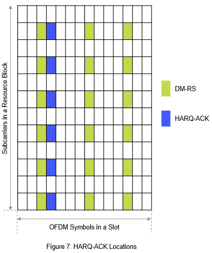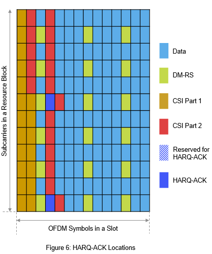 HARQ-ACK сопоставлен с REs в символе OFDM, который доступен после первых последовательных символов DM-RS OFDM. Количество REs, требуемого для HARQ-ACK, равняется 6. Поскольку это значение не больше половины количества REs, доступного для передачи UCI, отображение HARQ-ACK распределяется как показано в этом рисунке.