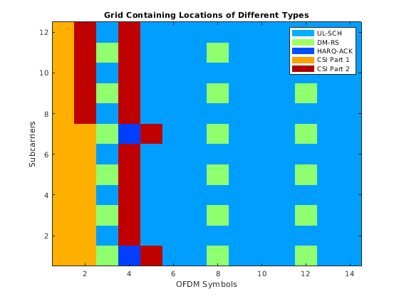 % Set the payload size of the HARQ-ACK bits to a value greater than 2 oack = 3; % Number of HARQ-ACK bits % Get the UL-SCH coding information info = nrULSCHInfo(pusch,tcr,tbs,oack,ocsi1,ocsi2); % Set random coded UL-SCH, HARQ-ACK, CSI part 1, and CSI part 2 bits culsch = randi([0 1],info.GULSCH,1); cack = randi([0 1],info.GACK,1); ccsi1 = randi([0 1],info.GCSI1,1); ccsi2 = randi([0 1],info.GCSI2,1); % Get the codeword and locations of each type (data and UCI) [cw,indInfo] = nrULSCHMultiplex(pusch,tcr,tbs,culsch,cack,ccsi1,ccsi2); % Create and plot the output grid for the first layer with predefined symbol % values for the different types createAndPlotGrid(carrier,pusch,cw,indInfo)
