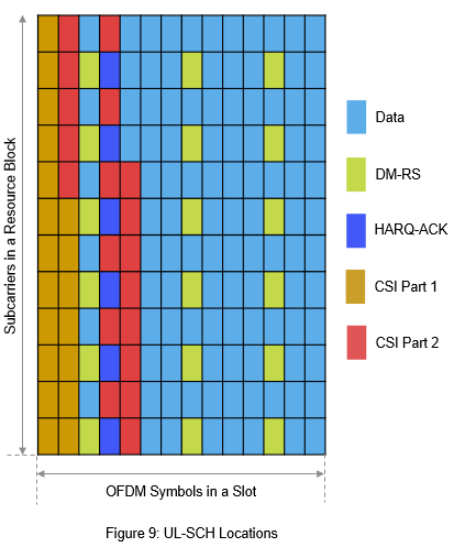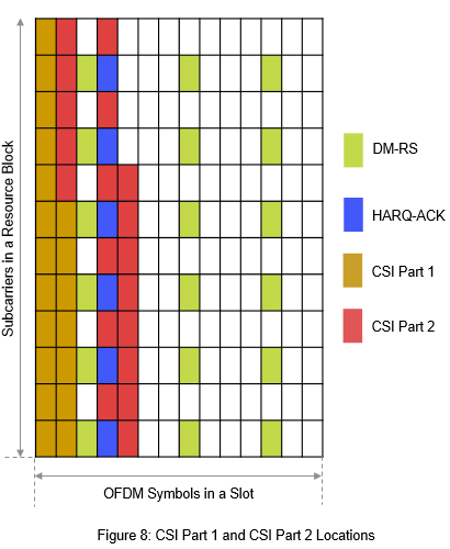 Сообщения восходящей управляющей информации (UCI) состоят из гибридного автоматического повторного подтверждения запроса (HARQ-ACK), информация о состоянии канала (CSI) и планирование запроса (SR). Эти сообщения UCI закодированы и переданы через физический восходящий канал управления (PUCCH) или мультиплексируются на PUSCH. Настройка создания отчетов CSI может быть апериодической (использование PUSCH), периодической (использование PUCCH) или полуперсистентной (использование PUCCH или DCI-активированного PUSCH). Отчет CSI включает две части. Часть 1 CSI имеет фиксированный размер полезной нагрузки и используется, чтобы идентифицировать количество информационных битов в части 2 CSI. Часть 1 CSI должна быть передана полностью перед передачей части 2 CSI. HARQ-ACK (если таковые имеются) и CSI (если таковые имеются) закодирован и мультиплексирован с или без закодированных данных UL-SCH, и затем передан на PUSCH.