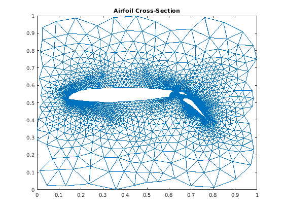 % Scaling x and y x = pow2(x,-32); y = pow2(y,-32); % Forming the sparse adjacency matrix and making it positive definite n = max(max(i),max(j)); A = sparse(i,j,-1,n,n); A = A + A'; d = abs(sum(A)) + 1; A = A + diag(sparse(d)); % Plotting the finite element mesh gplot(A,[x y]) title('Airfoil Cross-Section')