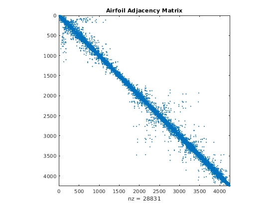 Данные хранятся в файле airfoil.mat. Данные состоят из 4 253 пар (x, y) координаты точек mesh. Это также содержит массив 12 289 пар индексов, (i, j), задавая связи между точками mesh.
