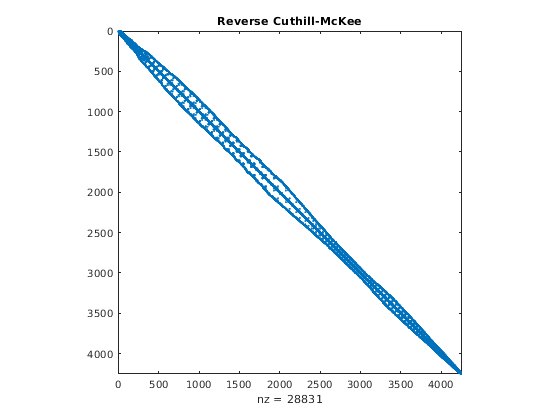 symrcm использует метод Обратного алгоритма Катхилла-Макки для переупорядочения матрицы смежности. r = symrcm(A) возвращает вектор перестановки r, таким образом, что A(r,r) имеет тенденцию иметь свои диагональные элементы ближе к диагонали, чем A. Эта форма является хорошим предварительным упорядоченным расположением для LU или факторизации Холесского матриц, которые прибывают из "долгих, тощих" проблем. Это работает и на симметричные и на несимметричные матрицы.