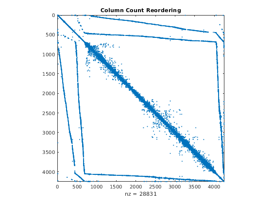 Используйте j = COLPERM(A), чтобы возвратить вектор перестановки, который переупорядочивает столбцы разреженной матрицы A в не уменьшающемся порядке ненулевого количества. Эта форма иногда полезна как предварительное упорядоченное расположение для LU-факторизации, как в lu(A(:,j)) J.