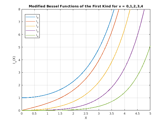 I = besseli(nu,Z) вычисляет измененную Функцию Бесселя первого вида, Iν (z), для каждого элемента массива Z. Порядок nu не должен быть целым числом, но должен быть действительным. Аргумент Z может быть комплексным. Результат действителен, где Z положителен.