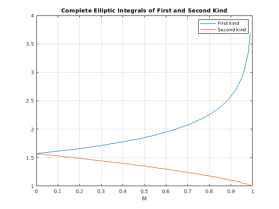 K = ellipke(M)[K,E] = ellipke(M)[K,E] = ellipke(M,tol)возвращает полный эллиптический интеграл первого вида для каждого элемента в K = ellipke(M) M.