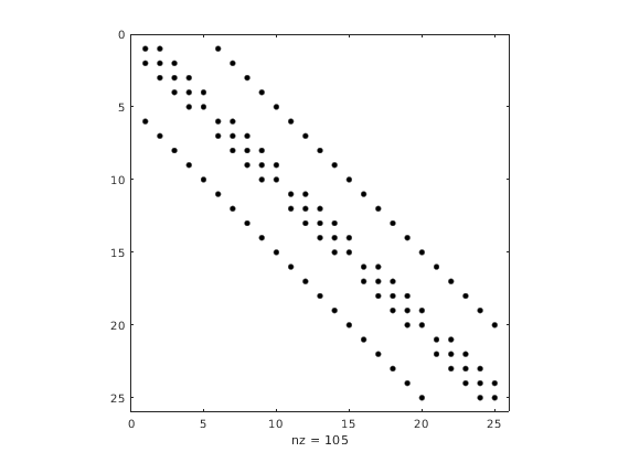 Матричным представлением дискретного Лапласового оператора на двумерном, n n сеткой является n*n n*n разреженной матрицей. Существует самое большее пять ненулевых элементов в каждой строке или столбце. Можно сгенерировать матрицу как Кронекеров продукт одномерных операторов различия. В этом примере n = 5.