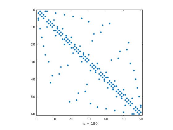 spy(S,markersize), где markersize является целым числом, строит график шаблона разреженности с помощью маркеров заданного размера точки.