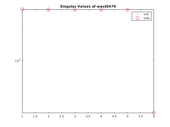 s2 = diag(S1); semilogy(s2(1:6),'r.') hold on semilogy(s,'ro','MarkerSize',10) title('Singular Values of west0479') legend('svd','svds')