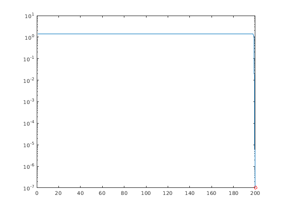 rownormR = sqrt(diag(R*R')); semilogy(rownormR) hold on; semilogy(size(R, 1), rownormR(end), 'ro')