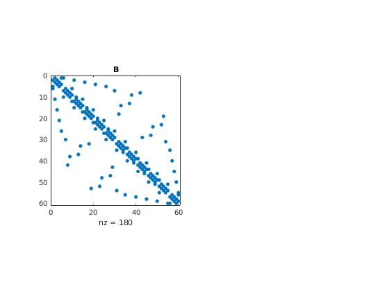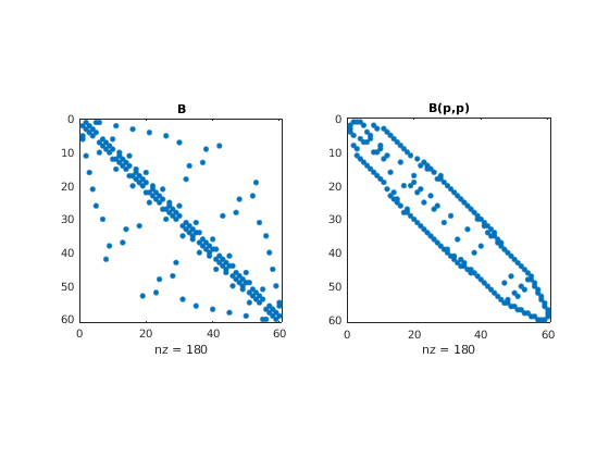 r = symrcm(S) возвращает симметричное упорядоченное расположение обратного алгоритма Катхилла-Макки S. Это - перестановка r, таким образом, что S(r,r) имеет тенденцию иметь свои ненулевые элементы ближе к диагонали. Это - хорошее предварительное упорядоченное расположение для LU или факторизации Холесского матриц, которые прибывают из долгих, тощих проблем. Упорядоченное расположение работает и на симметричный и на несимметричный S.