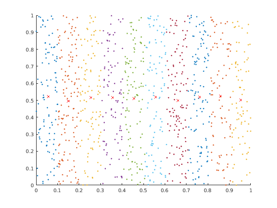hold on for k = 1:length(IA) plot(A(IA{k},1), A(IA{k},2), '.') meanAi = mean(A(IA{k},:)); plot(meanAi(1), meanAi(2), 'xr') end