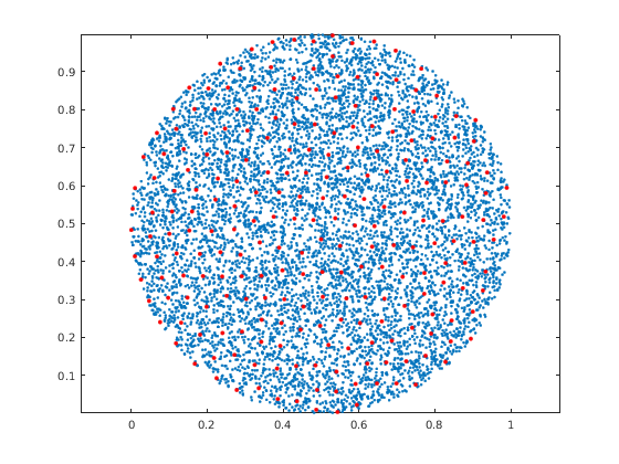 x = rand(10000,2); insideCircle = sqrt((x(:,1)-.5).^2+(x(:,2)-.5).^2)<0.5; y = x(insideCircle,:);