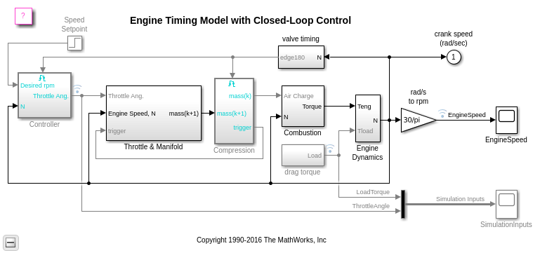Способность смоделировать нелинейные, сложные системы, такие как модель механизма, описанная здесь, является одной из ключевых возможностей Симулинка. Степень моделирования очевидна в представлении моделей выше. Simulink сохраняет точность модели, включая точно синхронизированные цилиндрические события потребления, который очень важен в создании модели этого типа. Полная система регулировки скорости проявляет гибкость Simulink. В частности, Simulink, моделируя подходы позволяют быстрое прототипирование управляемого прерыванием контроллера скорости вращения двигателя.