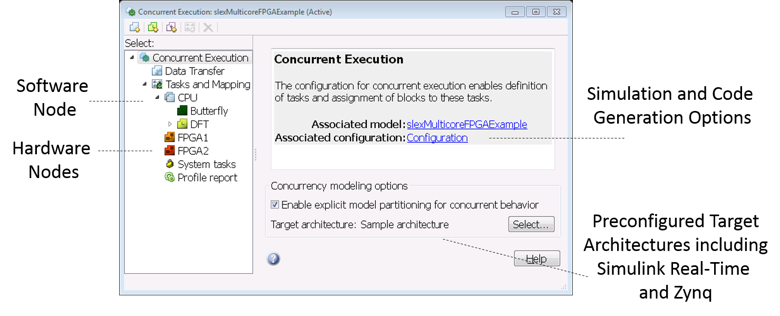 Можно измениться, как блоки сопоставлены с потоками и с FPGA в диалоговом окне Concurrent Execution. Можно также найти больше информации в документации