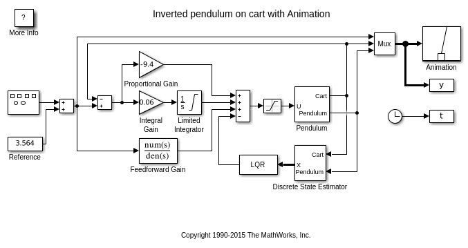 Этот пример показывает, как смоделировать инвертированный маятник. Анимация создается с помощью MATLAB® Handle Graphics®. Блоком анимации является S-функция маскированная. Для получения дополнительной информации используйте контекстное меню, чтобы посмотреть под маской блока Animation и открыть S-функцию для редактирования.