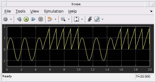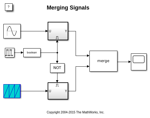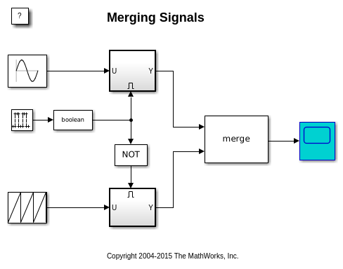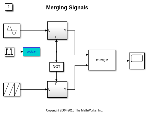 Можно запустить моделирование, чтобы видеть вывод блока Merge на Осциллографе. Заметьте, что тип формы волны, показанной на Осциллографе, изменяется каждые пять секунд. Это происходит из-за поведения блока Merge.