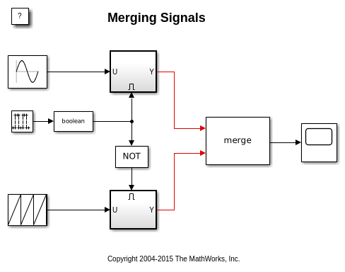 5. Соедините вывод двух условно выполняемых подсистем к входным параметрам блока Merge.