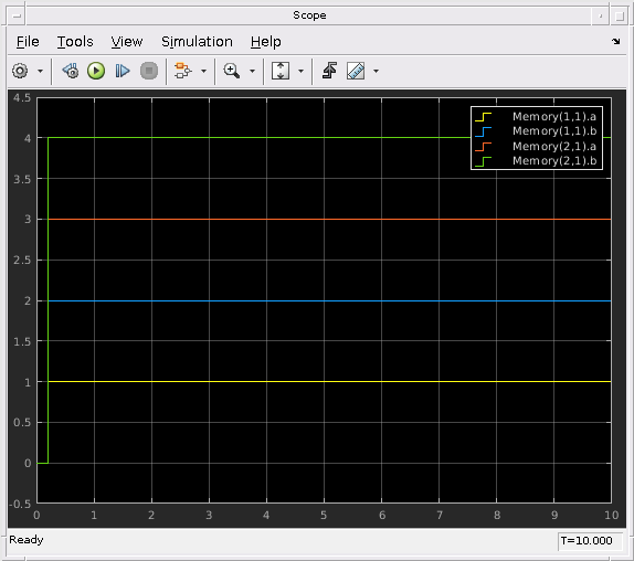В этом примере массив шин создается с помощью блока Vector Concatenate. Сигналы входной шины к блоку Concatenate должны быть невиртуальными и того же типа (то есть, иметь те же имена, иерархии и атрибуты для листовых элементов).