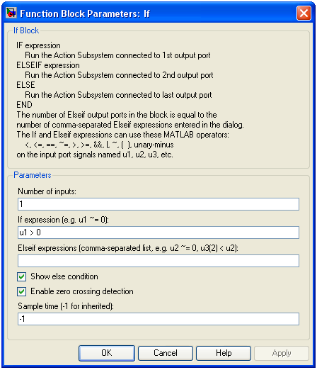 Блок 'If' использует сигнал LockedFlag переключиться между 'Заблокированными' и 'Разблокированными' подсистемами. Дважды щелкните по блоку 'If' по нему в модели, чтобы установить ее параметры (см. рисунок 2). LockedFlag представляет состояние муфты. LockedFlag = 1, если муфта заблокирована и LockedFlag = 0, если муфта разблокирована.