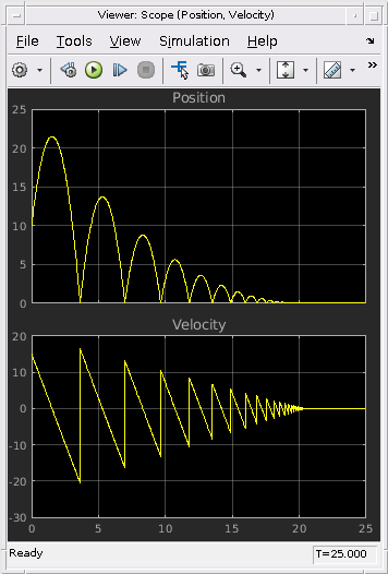 Порт состояния интегратора положения и соответствующего результата сравнения используется, чтобы обнаружить, когда мяч попадает в землю и сбрасывать оба интегратора. Порт состояния скоростного интегратора используется для вычисления