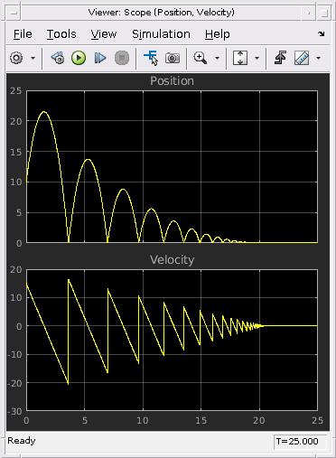 , достигает его предела насыщенности. Для модели прыгающего мяча эта опция поэтому подразумевает, что, когда мяч попадает в землю, ее скорость может быть установлена в различное значение, i. e., к скорости после влияния. Заметьте цикл для вычисления скорости после столкновения с землей. Чтобы получить скорость