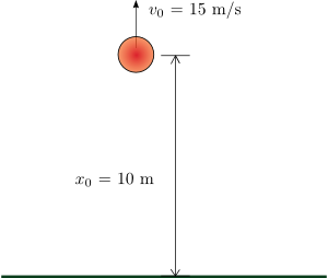 Рисунок 1: шар подброшен со скоростью 15 м/с от высоты 10 м.