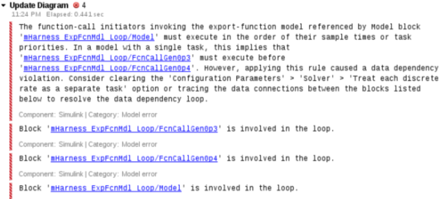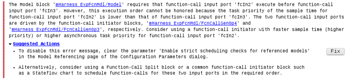 Если вы выбираете Configuration Parameter Enable строгие проверки планирования на модели, на которые ссылаются, и время компиляции и проверки на этапе выполнения гарантируют, что инициаторы вызовут вызовы функции на основе предопределенного порядка планирования. Инициаторы сортируются на основе их приоритетов частоты дискретизации. Для этого примера не соответствуют порядок планирования и приоритеты частоты дискретизации. Модель mHarness_ExpFcnMdl отображает ошибку.