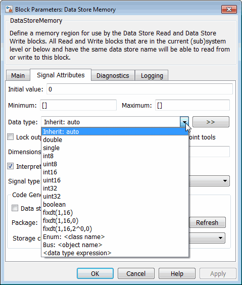 Допустимые значения типа данных отличаются среди блоков. Можно использовать выпадающее меню, сопоставленное с блочным параметром типа данных, чтобы просмотреть типы данных, которые поддерживает конкретный блок. Например, выпадающее меню Типа данных на диалоговом окне Блока памяти Хранилища данных перечисляет типы данных, которые это поддерживает, как показано здесь.