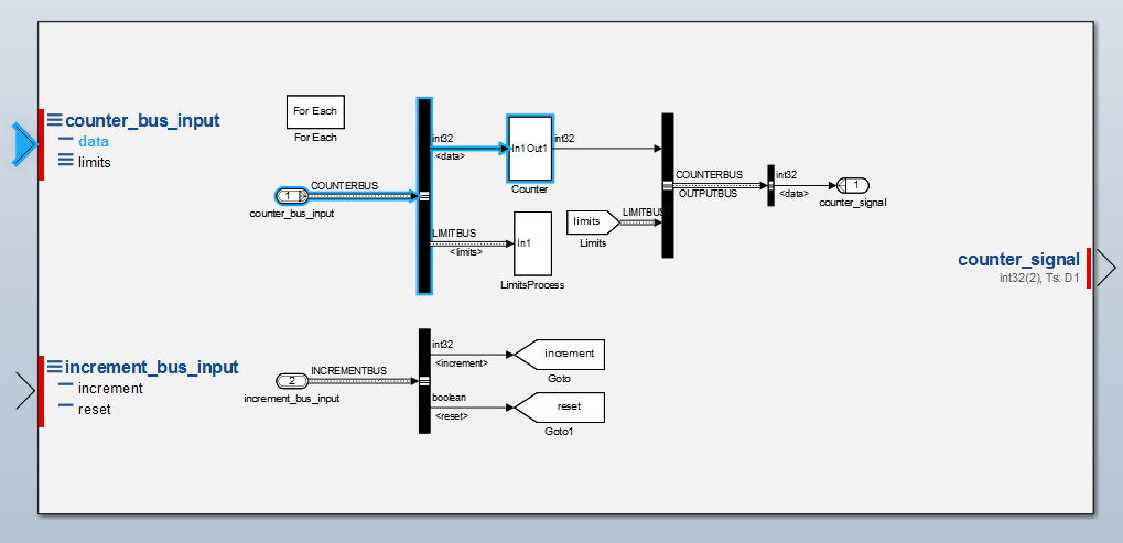 Эти три панели рядом с counter_input и интерфейсами increment_input указывают на входные сигналы шины. Единственные панели указывают на строки данных, такие как количества в секунду или командные строки, такой, как сброшено, чтобы запустить новую последовательность подсчета. Эти три панели, следующие за limits, указывают, что сигналы шины вкладываются в подсистеме СЧЕТЧИКА.