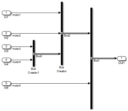 Например, в следующей модели, сигнал шины Bus3 комбинирует два сигнала, motor3 и motor4. Сигнал Bus2 комбинирует сигнал шины Bus3 и сигналы motor2 и motor1. Сигнал Bus1 комбинирует сигнал шины Bus2 и сигнал motor5.