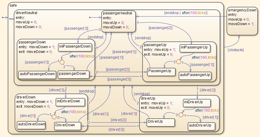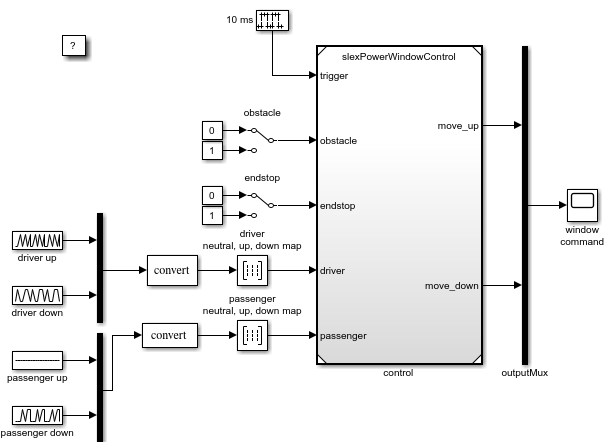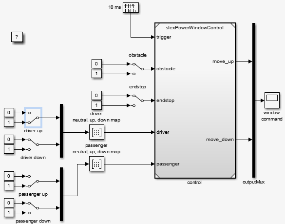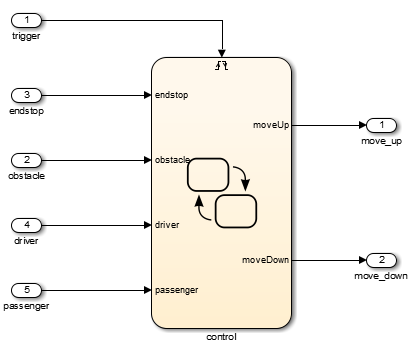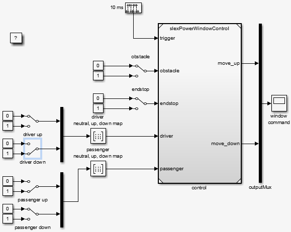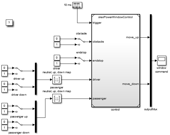 Для реализации в окружении Simulink смотрите Реализацию Схемы Действия: Управление Окном со стеклоподъемником.