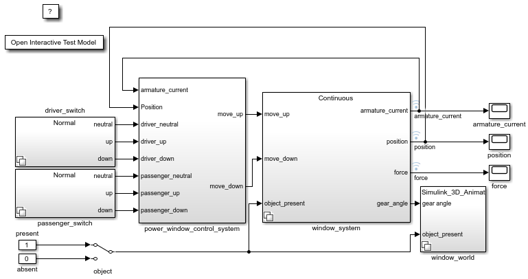 Чтобы открыть модель и исследовать более подробный вариант завода, в Проекте Simulink, запускают configureModel slexPowerWindowPowerEffects.