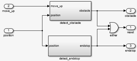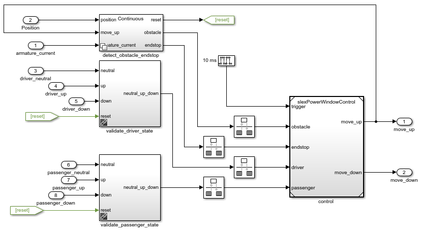 В модели slexPowerWindowExample блок power_window_control_system/detect_obstacle_endstop реализует эту схему действия в непрерывном варианте блока Variant Subsystem. Во время итераций проектирования можно добавить дополнительные варианты.