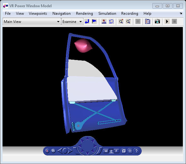 Если вам установили программное обеспечение Simulink 3D Animation, можно просмотреть geometrics системы в движении через мир виртуальной реальности. Если блок VR Sink еще не открыт в модели slexPowerWindowExample/window_world/Simulink_3D_Animation View, дважды кликните блок VR Sink.