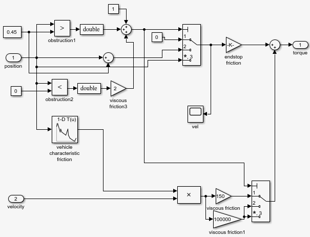 Реализация использует интерполяционную таблицу и добавляет шум, чтобы позволить оценку робастности управления. Чтобы видеть реализацию подсистемы трения, дважды кликните модель slexPowerWindowExample window_system/Power блок Effects - Visualization/detailed_window_system/plant/window/friction.