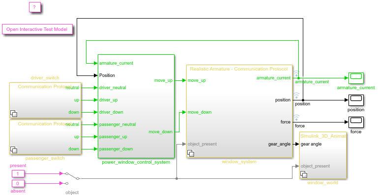 Чтобы просмотреть содержимое блока Realistic Armature - Communications Protocol, дважды кликните модель SlexPowerWindowExample window_system/Realistic Арматура - Коммуникации Protocol/detailed_window_system_with_DAQ.