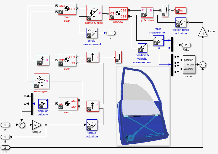 Эта реализация использует блоки Simscape Multibody для тел, соединений и приводов. Модель окна состоит из: