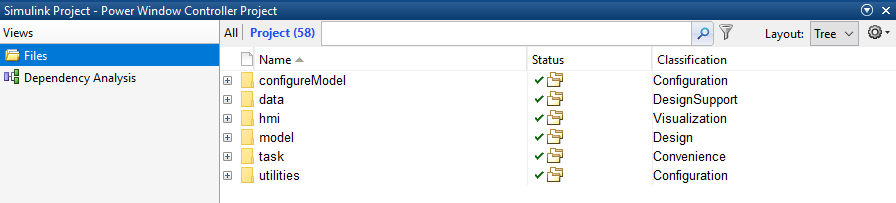 В Проекте Simulink перейдите к Файлам и нажмите Project Files. В configureModel папке запустите утилиту slexPowerWindowContinuous, чтобы открыть и инициализировать модель.