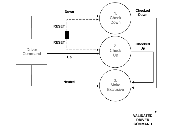 Третий процесс схемы действия проверяет, что программное обеспечение отправляет только одну из этих трех команд (neutral, up, down) к контроллеру. В фактической реализации и up и down могут быть одновременно верными (например, из-за переключателя возвращаемые эффекты).
