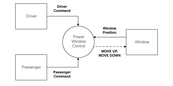 Фигура представляет схему контекста системы окна со стеклоподъемником. Квадратные поля получают среду, в этом случае, драйвер, пассажира и окно. И драйвер и пассажир могут отправить команды в окно, чтобы переместить его вверх и вниз. Контроллер выводит правильную команду, чтобы отправить к приводу окна (e. g., команда драйвера имеет приоритет над пассажирской командой). Кроме того, схема контролирует состояние оконной системы, чтобы установить, когда окно полностью открывается и закрывается и обнаружить, если существует объект между окном и кадром.